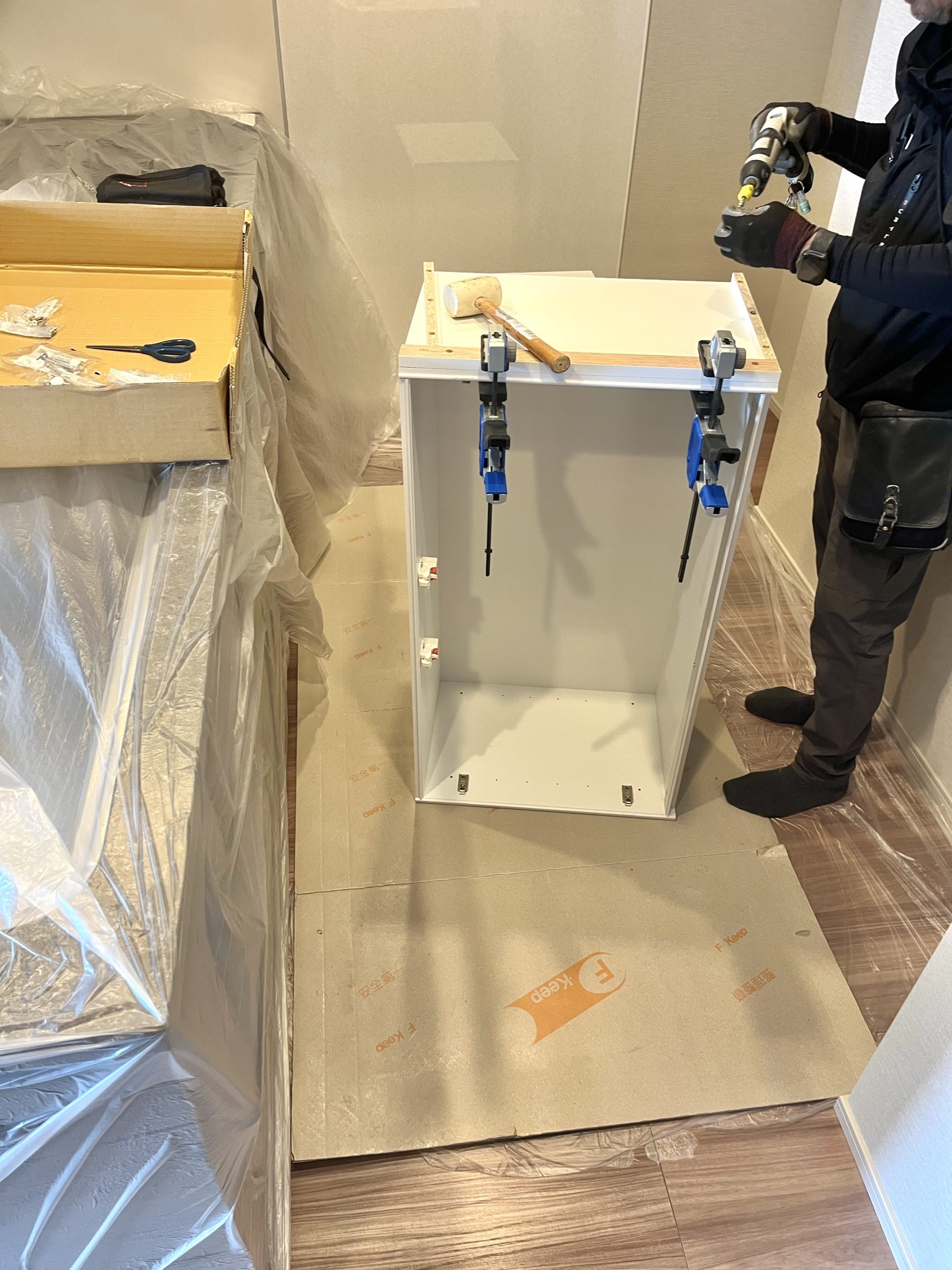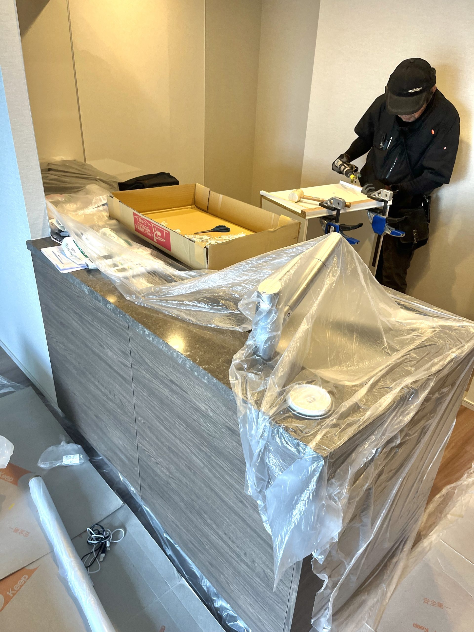 キッチンカウンターを養生してから、